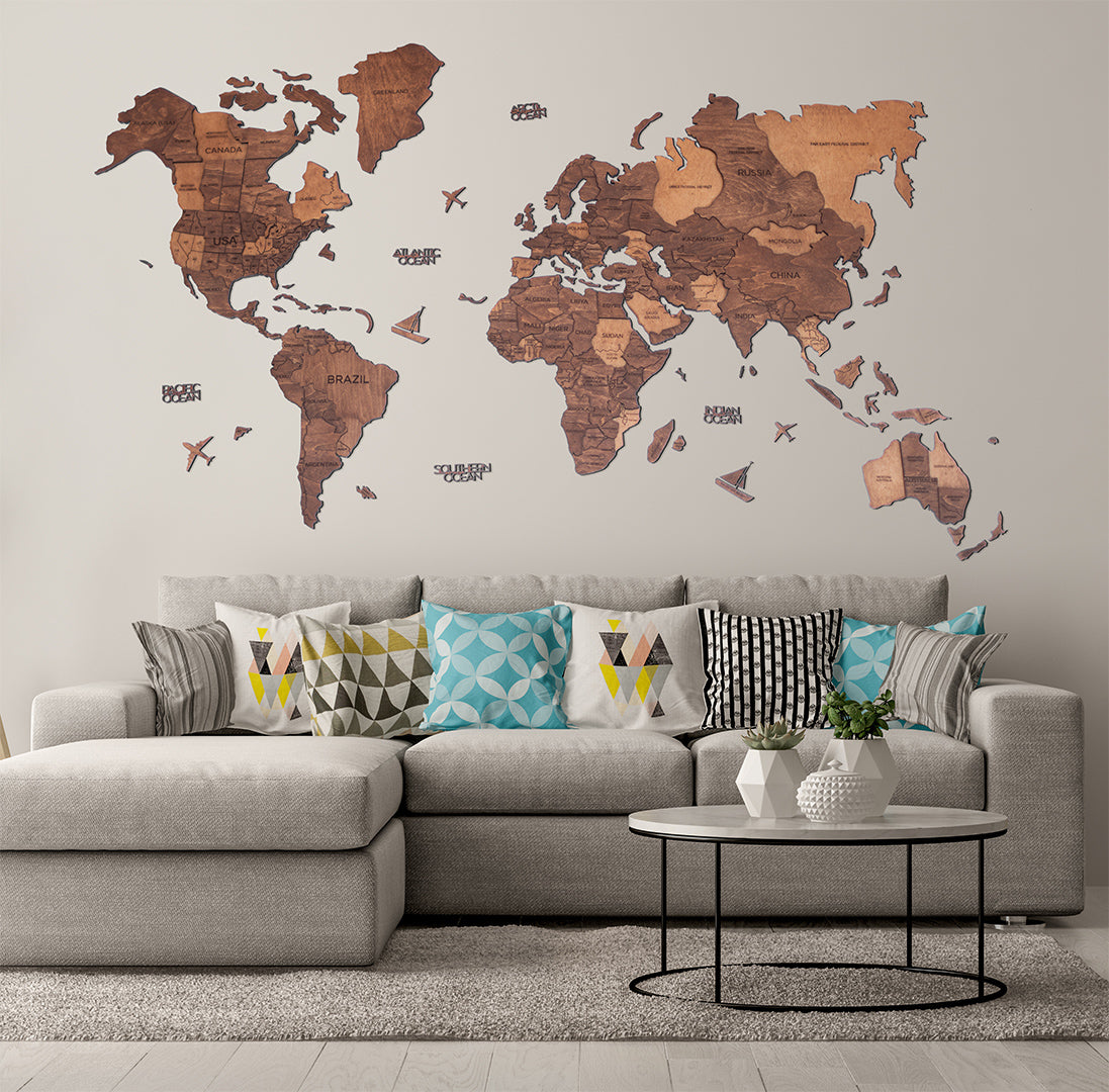Amplía tu estilo con arte de pared grande | Mapamundi Madera