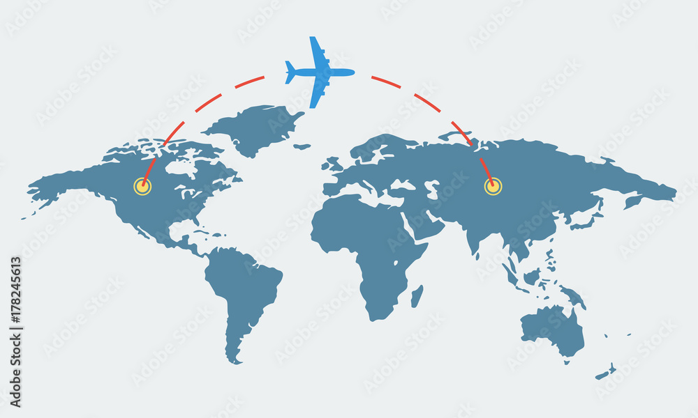 World map with plane. Travel and tourism concept. Airplane route